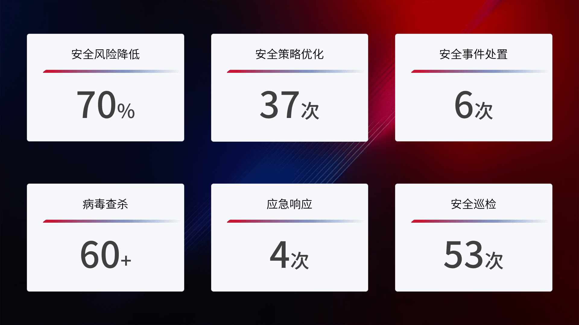 提供全面的安全事件报告体系,,包括处置报告、、、、周报、、、季度和年度总结,,,结合持续监控,,,帮助客户深入了解网络安全状况。。。